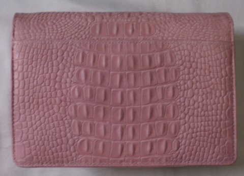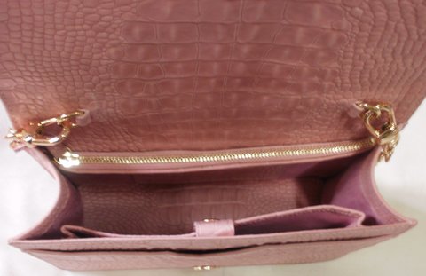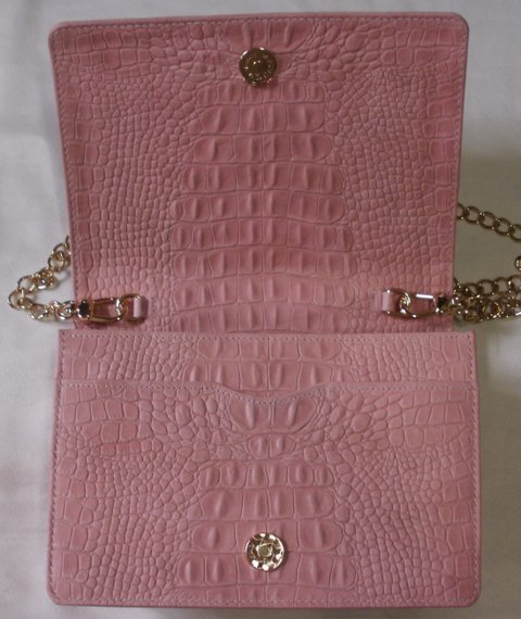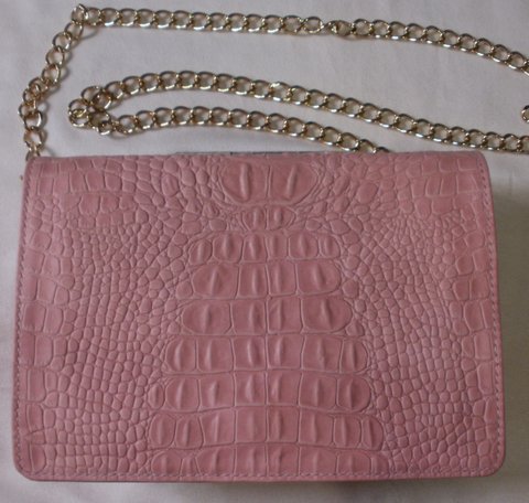 인디 핑크 컬러 악어 무늬 엠보싱 가죽으로 골드 도금장식과 체인으로 장식하여 제작한 핸드메이드 가죽 미니백입니다.(마디샤 가죽공예)