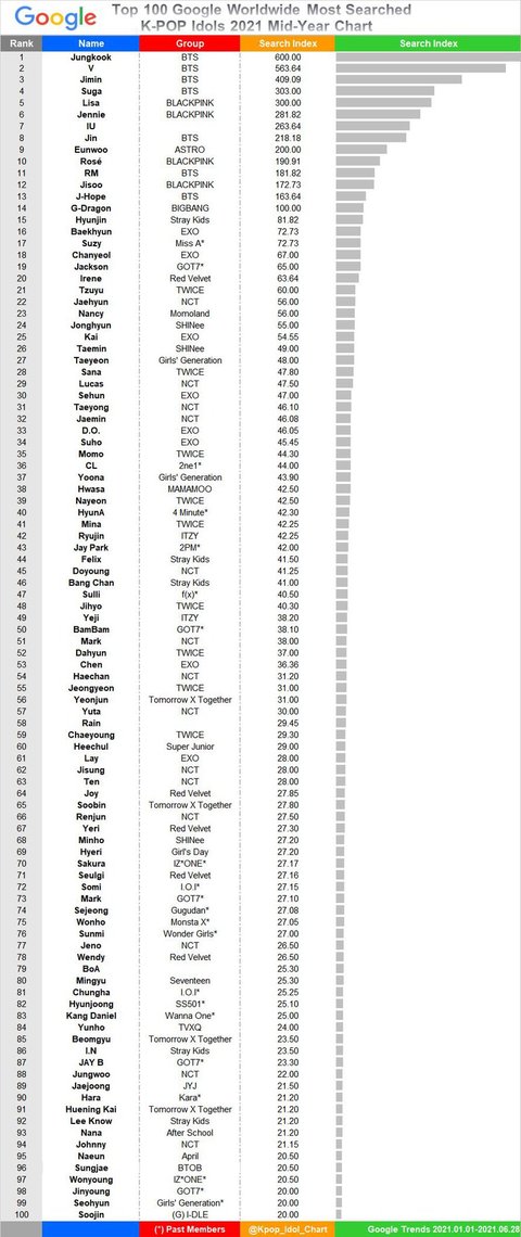 2021 상반기 구글에서 가장 많이 검색된 kpop 아이돌 순위