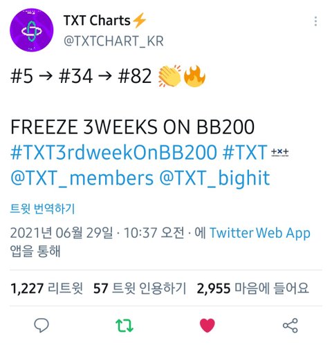 3주차인데도 100위 안에 있는거 진짜 대박..!! 울 투바투 화이팅.!!! ♡♡♡♡♡