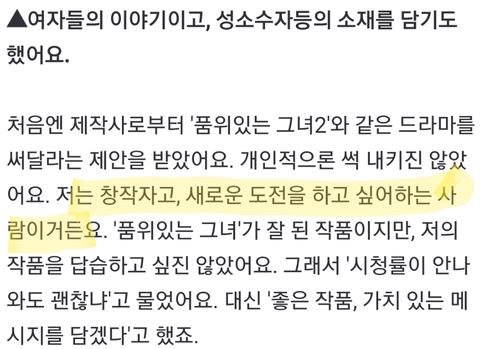 제작사로부터 '품위있는 그녀2'와 같은 드라마를 해달라고 제안받았으나,