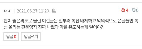 톡선딱지를 빼고 조회수 유입 막더니 하루 지나야 일베에 억지로 띄우느라 톡선딱지 다시 달더라. 근데 이게 넥스트레벨 티져 윈터사진 올라왔을때도 똑같이 이랬고 몇번이나 반복하고있음 그냥 두면 그 조회수 2~3배는 거뜬히 볼수있는것을 좋은글은 얼마 보지 못하게 막는거. 댓글 보면 확인돼