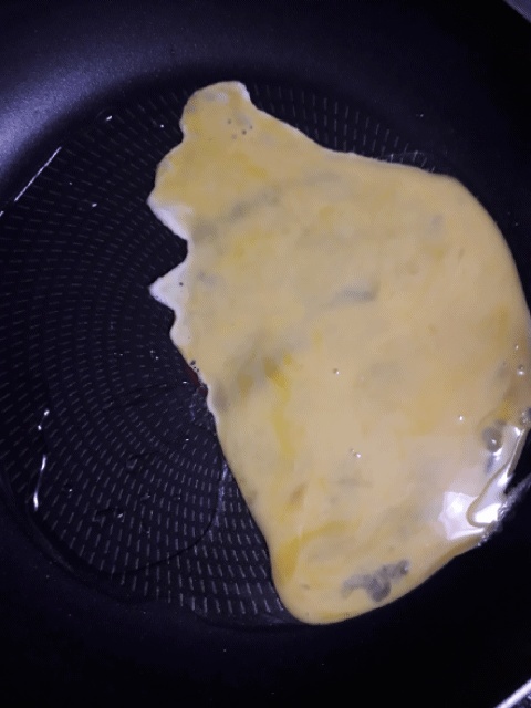 후라이팬이 다 달궈졌으면 아까 섞어뒀던 달걀을 넣고 스크램블 에그를 만들듯이 마구 섞는다