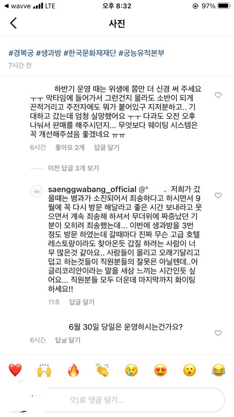 그리고 개선하겠다 죄송하다 그런 댓이 달렸길래 그냥 보고 넘겼죠 저는? 근데 좀 전에 알림이 또 와서보니까 생과방 계정으로 이렇게 댓 달아놨더라고요 잘못 본줄 알았잖아요ㅋㅋㅋ 바로 지웠던데 와..... 이번에야말로 너무 실망스럽네요 실망은 했지만 9월에 다시 하면 그땐 일찍 가서 다시 제대로 즐기고 싶어서 개선해달라고도 댓글 남긴거였는데 ㅌㅋㅋㅋㅋㅋ...... 이게 어글리코리안 소리 들을 일인가요? 진짜 기분 나쁘고 놀랍네요