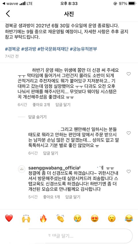 근데 그 전에 자리 안내 받기 전에 앞에서 주문 받는 남자 스텝이 (다른 사람들은 다 한복 입고 있는데 그 사람은 그냥 검은 반팔에 바지? 입고 그냥 알바 아닌거같아보였음) 되게 날씨덥고 사람 많고 그래서 그런지 되게 틱틱 대면서 성의 없게 주문 받더라고요 다과 다 떨어졌대서 아쉬웠는데 직원 태도가 그러니까 좀 기분 나빴는데 거기선 티 안냈고 사진에서 보이는 인스타 게시물 개선해달라는 댓 밑에 그 내용으로 하나 더 달았어요 기분 별로였다고.