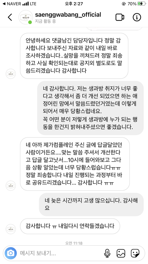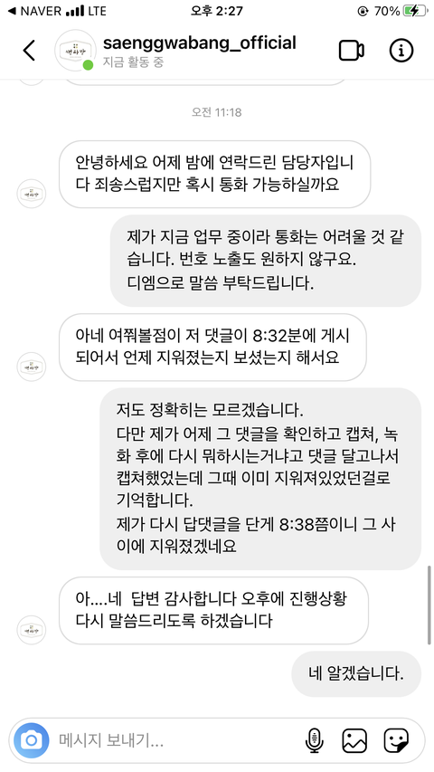 생과방 인스타에 내일이 마지막이라고 올라왔길래 저번에 갔을때 실망했다고 다음엔 이런이런 점 개선 됐음 좋겠다고 남겼어요.