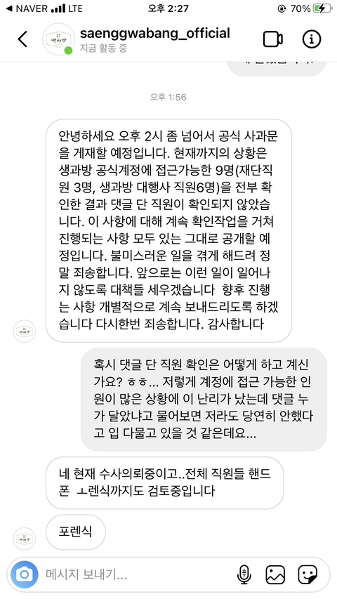 그리고 생과방의 사과문과는 별도로. 그 댓글 쓴 직원은 꼭 ^^ 말씀해주신대로 포렌식이라도 해서 밝혀주시길 바랍니다.