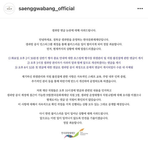 아무튼 사과문..... 은 제가 생각했던것에는 좀 못미치지만 사과문 올려주셔서 감사하고.. 이 난리가 났으니 하반기 운영에는 꼭 말씀드렸던 점들이 개선 되어 다른 분들이 불편함 없이 즐길 수 있는 생과방이 되었으면 좋겠네요.
