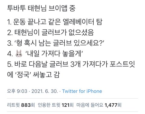 태현이가 오늘 브이앱에서 정국 선배님 일화 풀음! 둘 다 따숩고 귀엽다ㅠ ++++ 정국이형….ㅠㅠ 정국 태현 앞으로도 친목 많이 부탁한다…….