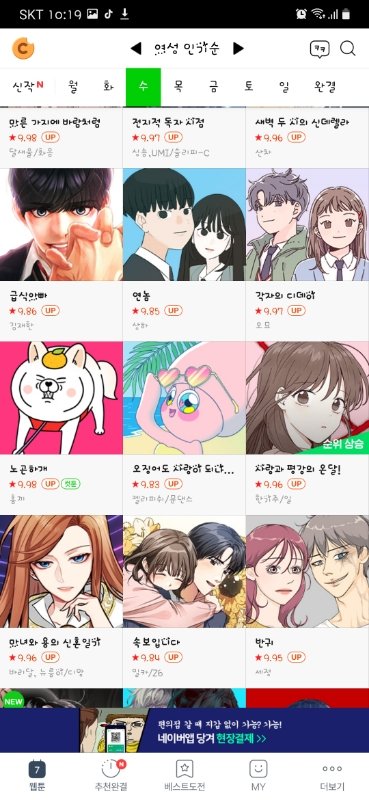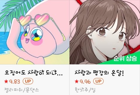 네이버 웹툰 앱으로 보는데 저 웹툰 두개가 나란히 있으니깐 순간 오징어 대가리가 칸을 뚫고 나온줄 암