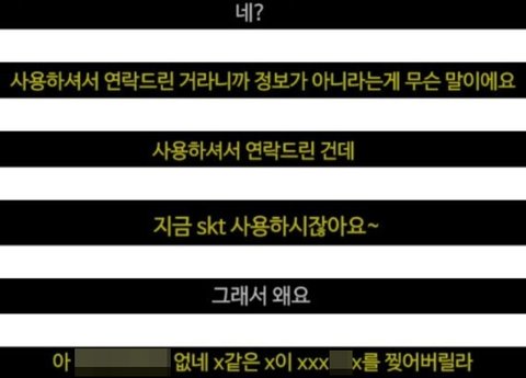 하지만 텔레마케터는 “사용하셔서 연락드린 거라니까 정보가 아니라 무슨 말이에요”라며 “사용하셔서 연락드린 건데 지금 SKT 사용하시잖아요”라며 다시 화를 냈다.