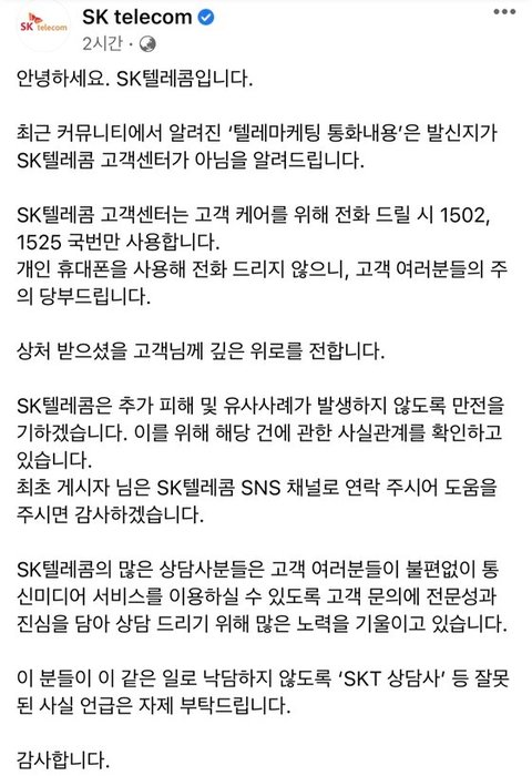 해당 내용이 SNS 등으로 퍼지고 논란이 되자 해당 통신사 측은 “텔레마케터가 자사와 무관한 것으로 확인됐다며 엄중 조치를 취할 것”이라는 공식 입장을 밝혔다.