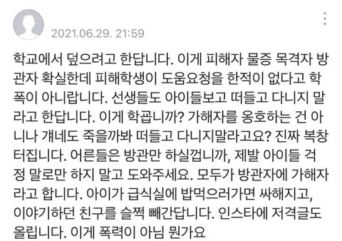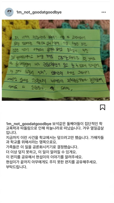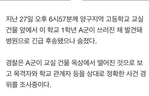 강원도 양구에 위치해 있는 강원 외국어 고등학교에서 일어난 사건입니다 학교폭력으로 인해 피해 학생이 학교 옥상에서 투신하는 극단적 선택을 했는데 학교 측에서는 이를 학업스트레스로 덮으려고 합니다 가해 학생들도 극단적 선택을 할 수 있다는 명목을 두고 학생들의 입막음도 하고 있습니다 네이버에는 학교 이름 없이 양구 자살 혹은 양구 투신 등으로 검색하시면 기사가 나옵니다 인스타에는 #강원외고 들어간 후 최근게시글 두번째 글을 보시면 피해 학생의 인스타가 있으며 현재 부모님께서 운영하고 계시는 상태입니다