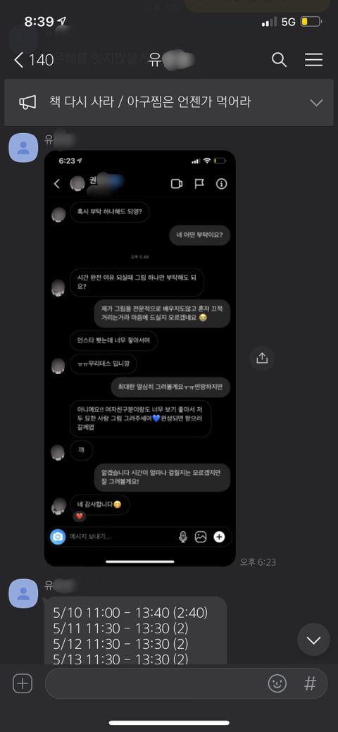 권씨가 유씨에게 DM으로 그림을 부탁한 날입니다. 그날 오후 2시경, 유씨는 연예인 권씨에게서 그림을 부탁하는 인스타그램 DM을 받았다고 제게 말을 해줬고, 저와 유씨는 연예인에게 연락이 왔다는 것을 매우 신기해했던 기억이 납니다. 그리고 그날 저녁, 제가 유씨에게 권씨가 보낸 DM 내용을 ‘기념으로 갖고 싶으니 보내 달라’는 말을 했고, 유씨는 그 DM 내용을 제게 카톡으로 캡처해서 보내줬습니다. 아래는 그 증거 사진입니다.