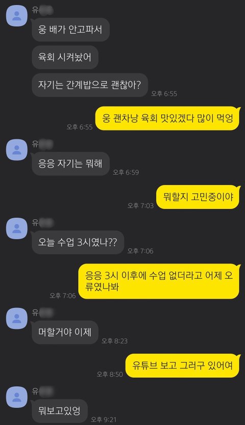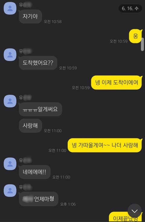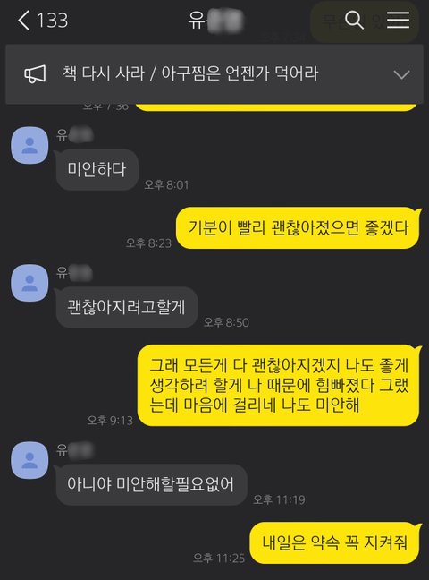군대 선임을 만나러 간 후, 저와 유씨는 일상적인 대화를 이어갔습니다. 이 대화가 권태기에 빠진 커플의 대화 같은가요..? 유씨는 평소와 같이 제가 밥을 잘 먹었는지, 제가 뭘 하고 있는지 궁금해했고, 그건 저 역시 마찬가지였습니다. 유씨의 연락이 뜸해지기 전까지 저는 유씨에게서 그 어떤 이상함도 느끼지 못했습니다. 해당 대화에서 제 개인 정보나, 주변인과 관련된 내용이 포함된 부분은 제외하고 올린다는 점, 양해 부탁드립니다.