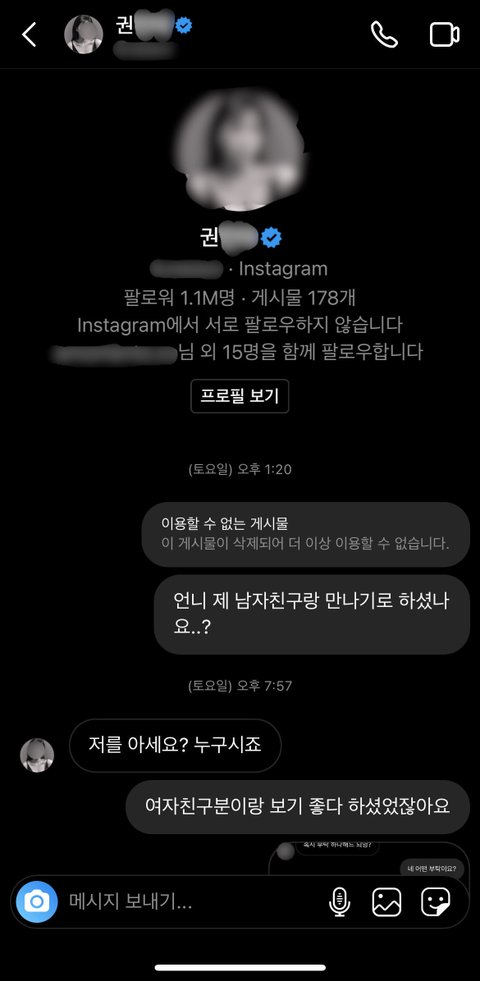 제가 권씨에게 첫 디엠을 보냈던 날짜와 시간을 확실하게 보여드리기 위해 아래 이 사진도 첨부합니다. 이용할 수 없는 게시물이라고 뜨는 이유는, 권씨가 게시물을 지운 이 후에 제가 캡처했기 때문입니다.