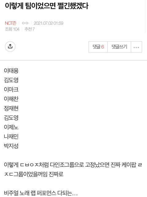 유 조합으로 보고 싶은 멤도 아니고 저 멤으로만 데뷔했으면 레전드 그룹이 됐을 거란 글에 추천이 저렇게 박히고 이게 왜 먹금이냐는 댓까지 올라옴 진짜 여기에 오만정 다 털림