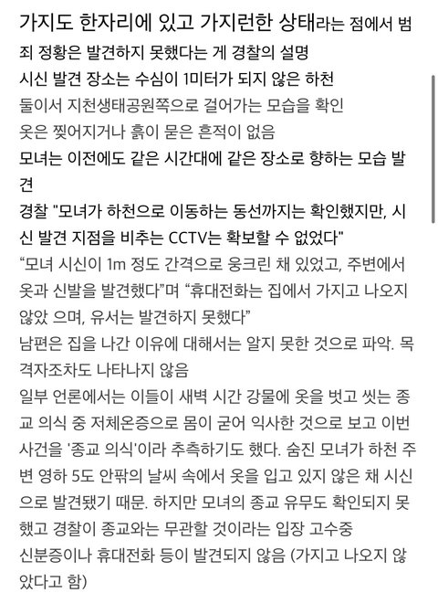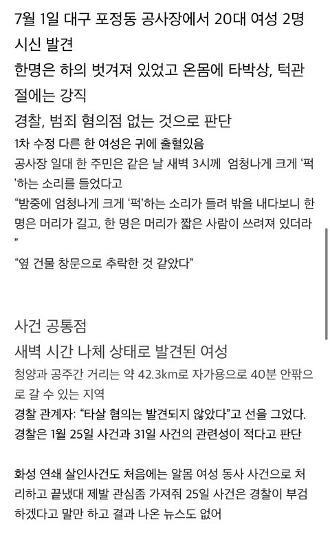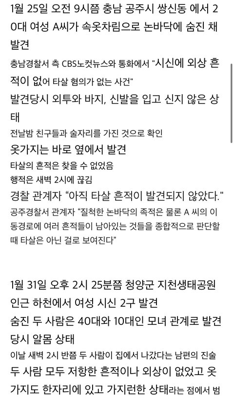 아니 나 남자 진짜 맞는데 우리 여자형제가 공주에서 살아서 그런지 이 사건 진짜 너무 소름끼치는데 한동안 공론화되는 거 같다가 바로 묻히더라? 그래서 너무 답답해 교수들이 사람이 동상에 걸리면 뇌가 덥다고 인지해서 옷을 다 벗게 되고 결국 저체온으로 사망한다는데 진짜임? 나는 이게 같은장소에서 연속으로 일어나는데 논란안되는것도 이상하고 대한민국 건국 이래로 동상으로 연쇄사망하는 사건이 이제야 발생하고 그것도 같은장소에 비슷한시기, 특정성별 아니 이게 말이 돼?