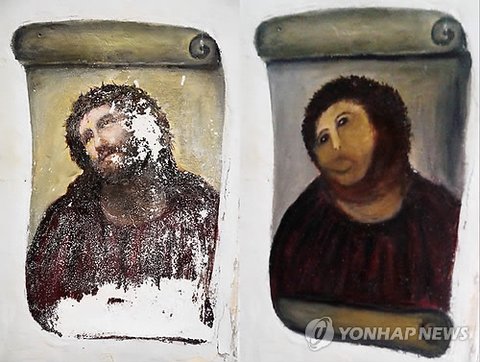 처음에 박제만 보고는 아래 그림같은 공무원들의 예산 떼먹기 상황인줄 알았는데(전문가한테 맡겨야 하는걸 동네 그림 취미로 그리는 할머니한테 푼돈주고 시킴)밑에 설명 보니까 박제사는 최선을 다했네........ tmi로 저 복원 뒷얘기는 저 웃긴 복원작 보려고 관광객 증가함ㅋㅋㅋㅋ