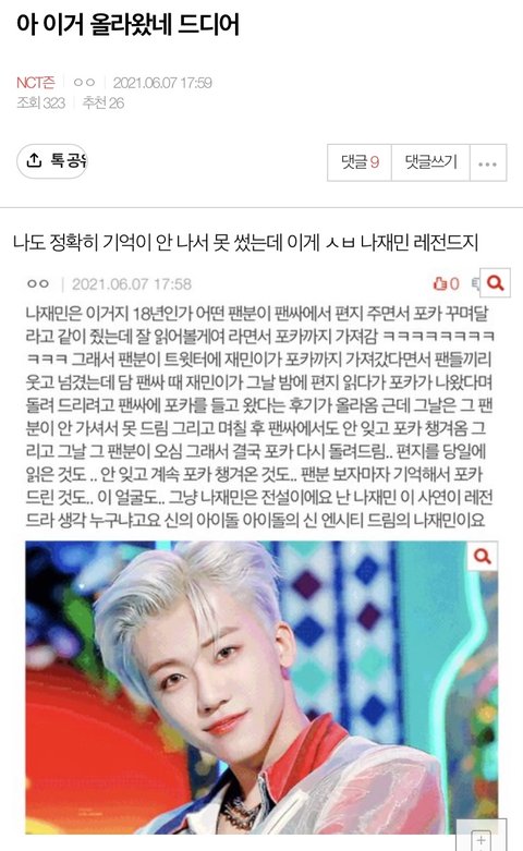 +) 어제 너무 힘들어서 탈판했어. 난 잼프도 아닌데 재민이를 향한 악플들을 버틸 자신이 없더라, 그런데 너네 댓글들 보면서 힐링했어 나 같이 생각하는 사람들이 많이 있구나 느꼈어. 나는 재민이가 언제까지나 행복하길 원해 재민이가 나를 행복하게 해준거처럼. 그리고 시즈니 이야기를 해줄 때마다 재민이를 좋아하길 잘한거 같다는 생각이 들어 그 생각이 평생 갈 수 있었으면 좋겠어