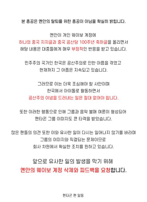 제목: 펜타곤 옌안 개인 웨이보 관련 피드백을 요청합니다