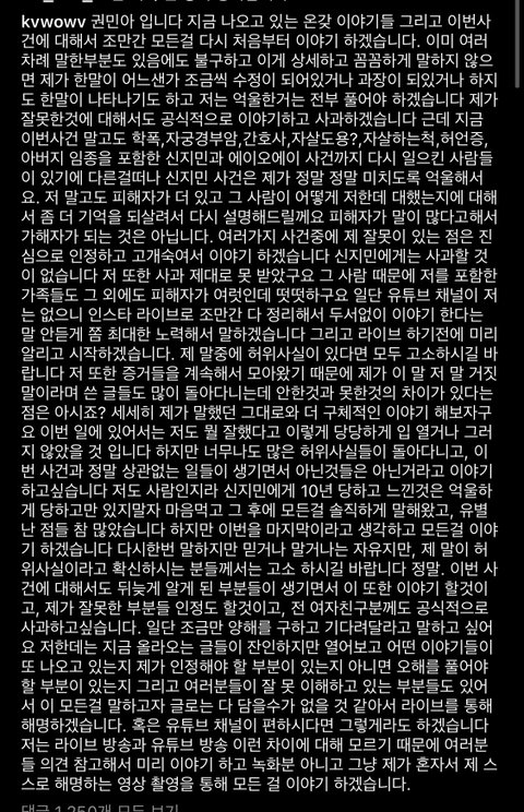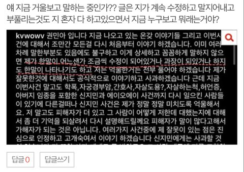 새벽틈타서 새 입장문 올라왔는데 이렇게 긴 글 중에 피해자분께 사죄하는 말은 단 한줄도 없음^^ 공개적인 곳에서 남의 소중한 아버님을 ㅅㅇ협박한 사람으로 몰아갔으면 자기가 아무리 억울한게 있어도 일단 사과부터 드리는게 당연한 상식 아님?? 정말 상식을 뛰어넘는.... 처음부터 끝까지 그저 신지민 신지민ㅋㅋㅋ심지어 자기말에 허위사실 없다고 말하는 글쓰면서 또 소설 집필하셨대!!ㅋㅋ그리고 역시 실시간으로 수정중..