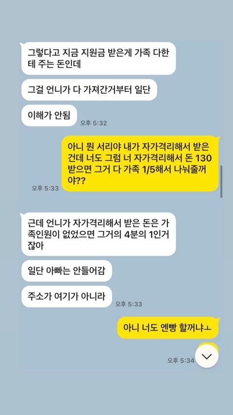 이제 한 달 좀 넘어서 자가격리 지원금이 90만원정도 나왔어 (4인가구 기준, 일할계산) 근데 둘째 동생이 이걸 가족 모두 엔띵해야 한다고 주장해. 자기가 없었으면 4인가구로 안 나왔을거래. 나는 내가 자가격리한거고, 심지어 내가 자가격리할때는 얘가 집에 같이 있지도 않았어서 얘가 왈가왈부할 문제는 아니라고 생각하거든. 차라리 엄마를 나눠드리던가. (엄마 나눠드리는 것도 엄마랑 나랑 얘기할 문제지 동생이 언급할 문제는 아니라고 생각해)
