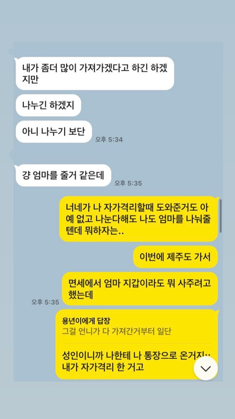 이제 가서 쓸 돈을 좀 정해야 돼서 내가 통장하나에다가 같이 돈 넣자고 했어 나는 이번 여행에 넉넉잡아 70을 넣으려고 했어 (2인용 비행기, 숙소 포함) 그리고 동생한테도 많게 잡아서 30 넣으면 되겠다고 하니까 동생이 갑자기 언니는 자가격리 지원금으로 내고 자기는 여태까지 자기가 모은 돈에서 내는게 아깝대. 자기가 없었으면 자가격리 돈 그렇게 나오지도 않았을 거라고. 나는 얘가 이렇게 자가격리 지원금 나한테 나온거에 대해서 당당하게 요구하는게 이해가 안가.그래서 차라리 여행얘기 엎고 90만원 중에서 엔빵해서 니 몫 18만원을 주겠다 하니까 그건 또 싫은가봐.