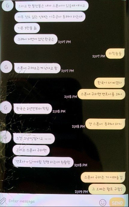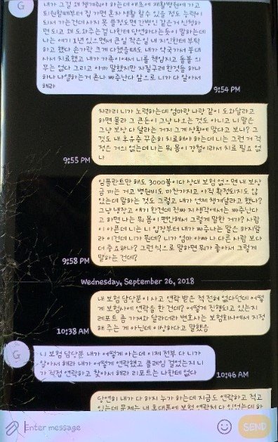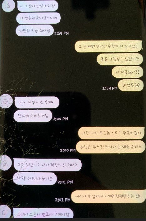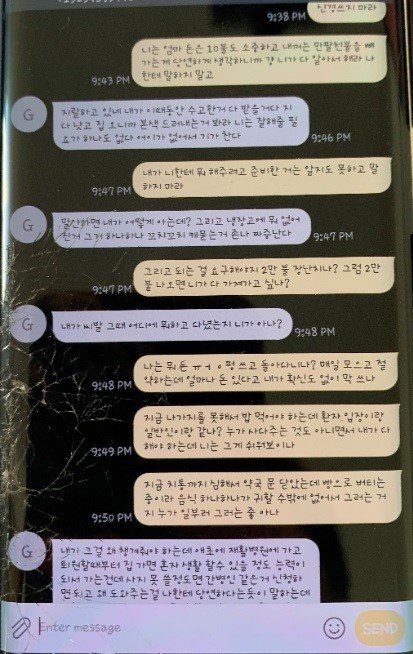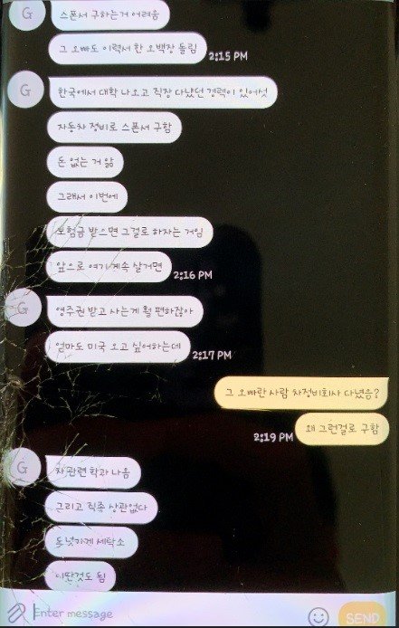 그 뒤에 제가 카드를 달라고 하니까 그게 왜 필요하냐면서 묻던데(소지품 중 가방 안에서 지갑과 휴대폰만 사라져서 이상하다고 생각했었던 후에) 아니 개인 물건을 왜 네가 가지고 있냐고 하니까 그때서야 주더라고요. 뭔가 이상하다고 생각했는데 그렇게 퇴원 후 요양시설 쪽으로 가서 4주 정도 더 있다가 퇴원했는데 그 후에 동생이 갑자기 취업이민? 변호사에 대해 얘기를 꺼내기 시작했었습니다. 자기가 아는 오빠가 변호사를 사서 취업 이민을 신청했는데 만몇불이 들더라. 고 그래서 그 사람은 하는 일이 있었겠지 라고 말을 하니 자기도 그렇게 취업이민을 할 수 있다고(어학연수 와서 랭귀지 스쿨 다니고 있는 상태에서?)요, 그래서 그 변호사가 네게 그렇게 말했었으면 그건 취업 사기에 가깝고 공부하는 학생에게 스폰서를 주는 회사는(아니면 가게는) 없다고 말하니 자기는 할 수 있다면서(?) 자기한테 그 자금을 달라고 하더라고요. 그래서 그건 네가 해야 할 일이고 내가 줄 수는 없다고 말하니 자기는 이때동안 수고한거(?)를 다 받을 거고 제가 다 낫고 집에 돌아오니 본색을(?) 드러낸다고 어이가 없다고 말하더라고요. 본인 얘기를 다른 사람한테 그대로 하는 걸 보고 어이가 없어서 무시했는데 사진 첨부한 것 외에 카톡으로도 온 것이 있었었는데 보기 힘들어서 지웠었습니다. 정말 돈 안 줄 거냐면서 -안 주면 내가 변호사 선임해서라도 꼭 받아낼 거다 .라고 하더라고요. 일반적인 사람이라면 당연한 행동을 당연하게 하지 않는 것을 보고 대화로는 가르칠 수가 없다고 생각했습니다..