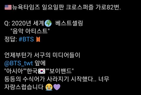 아 이거 ㄹㅇ... 방탄 앞에 맨날 뭐 아시아 사우스코리아에서 온 케이팝 보이밴드로 이번에 빌보드에서 어쩌구저쩌구 아미들이 대단하다 어쩌구저쩌구 등등 수식어가 ㅈㄴ 붙었었는데 언제부턴가 그냥 월드스타 bts 이런식으로 소개하고 끝나더라.. 눙물남ㅅㅂ