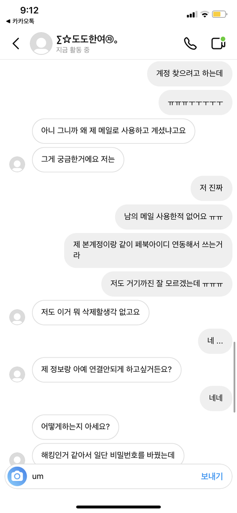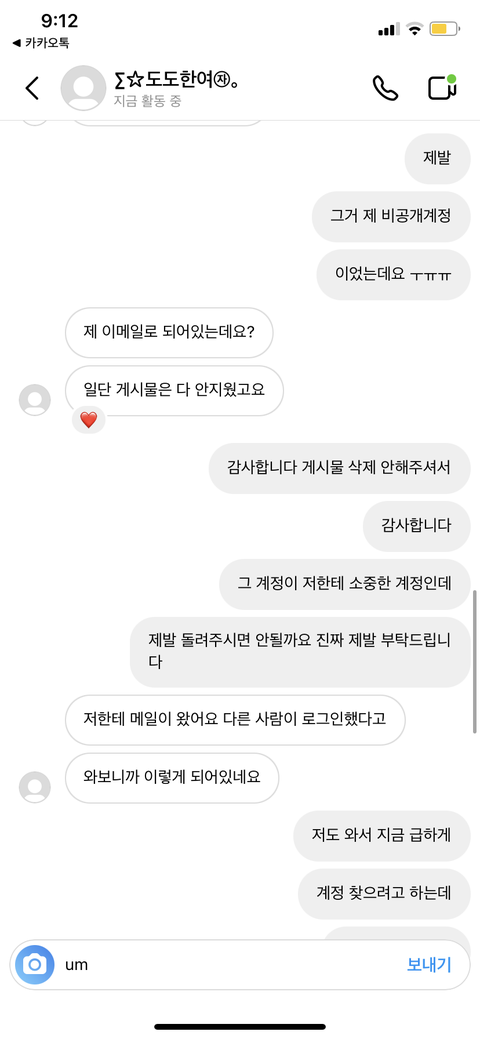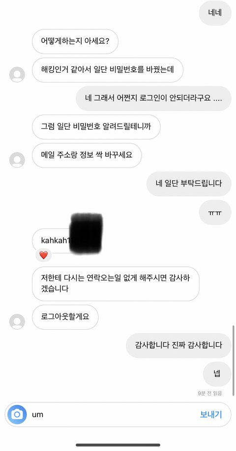 잠만 순서 뒤죽박줄일수도 있는데 갑자기 메일로 서울에서 누가 삼성폰으로 로그인했다고 떠서 (나는 아이폰 /경기도) 보니까 딴건 다 괜찮은데 내 비계가 팔로잉팔로워 다 끊겨있고 아이디도 전에 했던걸로 바뀌어있어서 내 본계로 디엠해서 내 비계랑 대화한거임 나 진짜 무서워서 죽을뻔해서 독서실에서 입이 덜덜덜 떨리고 턱이 떨려서 진짜 캐스터네츠 소리나서 턱 붙잡고있었는데 더 ㅈㅗ ㅈ같은건 저 사람이 바꾼 비밀번호 숫자가 내 생일이야 ㅆㅣ발