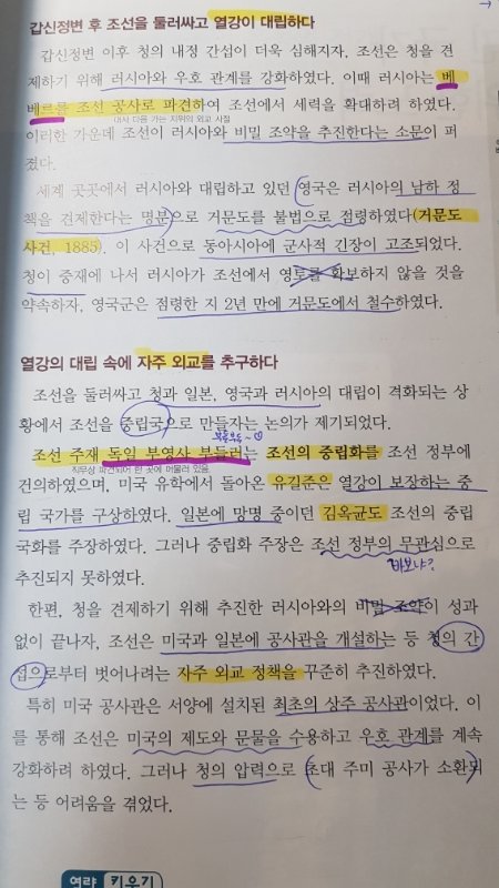보통 벼락치기 하면 대충 여러번 반복하는 사람 많은데 그러면 좀 어려운 서술형이나 문제 꼬아서 내면 무조건 틀린다고 봐ㅠㅠ 그래서 일단 밑줄치면서 한번 쭉 완전 꼼꼼히 읽어!! 그래도 한국사는 배경지식이 대충 있잖아 반면 완전 처음 보는 내용도 있을거고 처음부터 통으로 외우려고 하지말고 꼼꼼히 보면서 잘 모르는 것들 체크해두기!! (난 노랑 형광펜 추천)