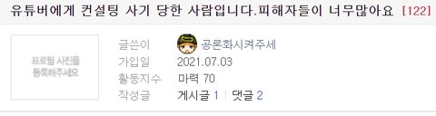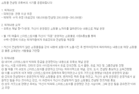 월 1억 매출 스마트스토어가 자신의 것이라고 거짓, 내용도 다른 쇼핑몰을 따라하라는 말만 있음.채널에 사과영상이 올라왔으나 몇 시간 뒤 사과영상을 내리고 잠적. 피해자분들은 집단 소송 준비 중