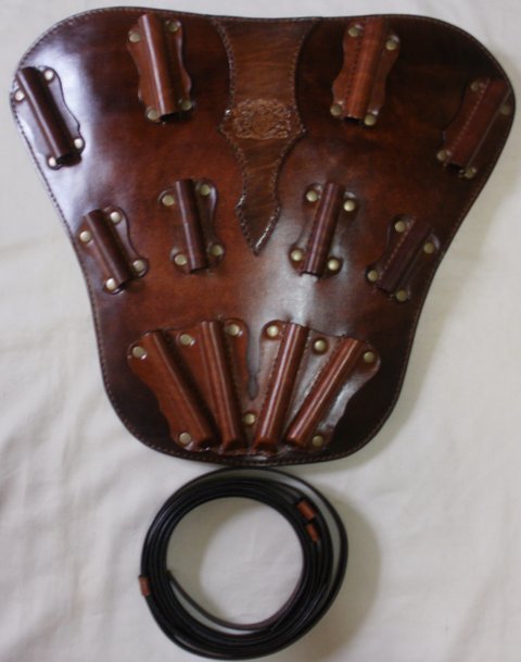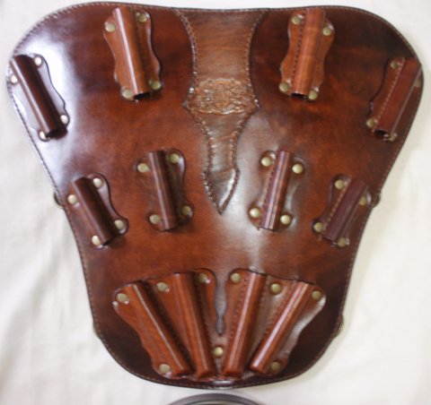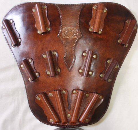 베지터블 가죽에 천연 염색을 하여 수작업으로 제작한 핸드메이드 경극용 백팩형 가죽 깃발 꽂이입니다.(마디샤가죽공예)