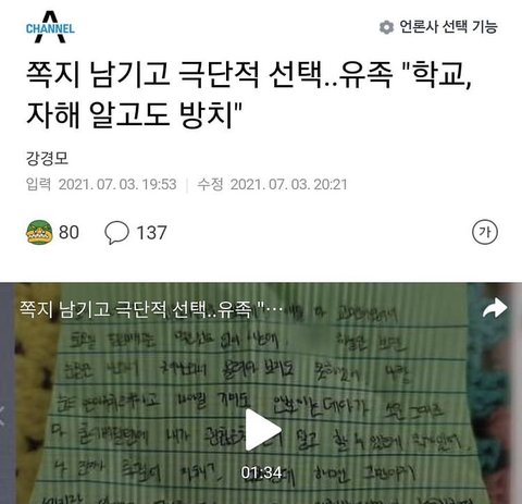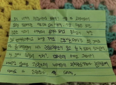 유족분들이 유품을 정리하다가 보니 편지 한장울 발견했습니다. A군이 친구에게 끝끝내 보내지 못한 편지입니다. "나 진짜 죽고싶어. 자해? 안보이는데 하면 그만이지•• 아마도 나 안 괜찮아 도와줘."
