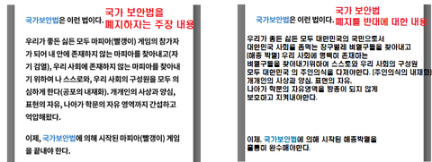 국가보안법이란 국가의 울타리를 견고히 해주는 법입니다.휴전중인 대한민국에 가장 필요한 법이라고 할 수 있어요이게 없다면 간첩들을 어떻게 걸러 낼 수 있을까요?세상에 공산주의가 존재하는 한 지켜져야 하는 법입니다.대한민국은 민주주의 국가입니다 여러분,이 법을 이용하여 엄한 사람을 빨갱이 프레임 씌워서 죽이는 존재가 쓰레기인거지대한민국에 존재하여서 문제될 것이 없는 법 입니다.아래 사진은 국가보안법을 폐지하자는 주장과, 폐지를 반대한다는 주장의 내용입니다.양쪽을 내용을 모두 보시고 현명하게 판단해주시길 바라여 두 내용 모두를 올립니다.