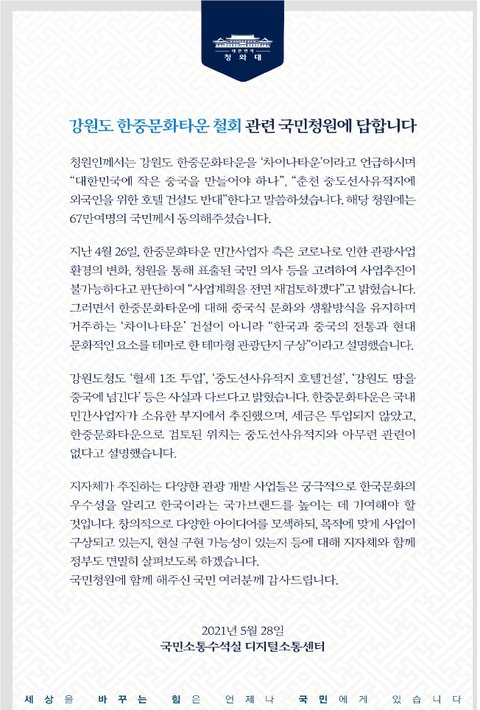 1. 강원도 춘천 차이나타운 청원 30만 달성 후 청와대 측 답변을 받았지만 황당한 답변이였음,