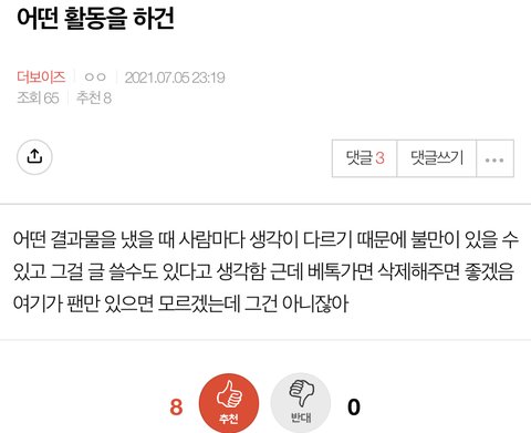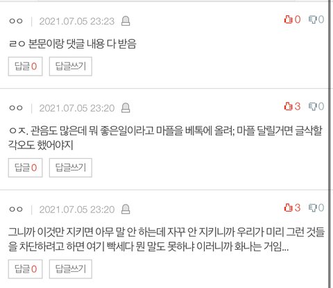 그 글만 우루루루 쏟아져나왔음… 플 끝났는데도 또 갑자기 오고 저 글이 아마 플 끝나고 온 글일 걸? 마플 탄 글 다 삭제 안 했을 거야 아마 ㅋㅋㅋ 그래 의견낼 수 있지 근데 베톡 가거나 니가 생각해도 워딩이 셌고 어그로 끌릴 거 같이 써놨으면 시간이 지났으면 삭제할 생각을 해.. 우리가 언제 말을 못하게 했냐 말은 하되 나중가서 삭제하라는 거잖아 그걸 못하냐 그리고 베톡 갔는데도 조용한 거보면 걍 쟤는 더비아닌 거 같애