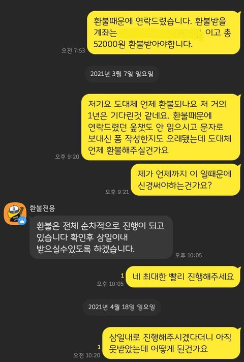 내가 인형을 구매했었는데 그게 한 1년 반쯤 전이야 금액은 톡에서도 나와있듯이 52000원이고..... 근데 이사람이 톡도 안읽고 지금 짹으로 언급해놓기는 했는데.... 1년 반이나 끌고다니니까 언제 받을 수 있을지도 모르겠고... 고소하기에는 내가 고3이라 시간이 적은데 혹시 어떻게 받을 수 있는 방법이 없을까