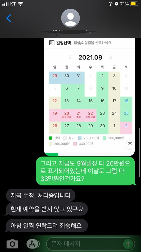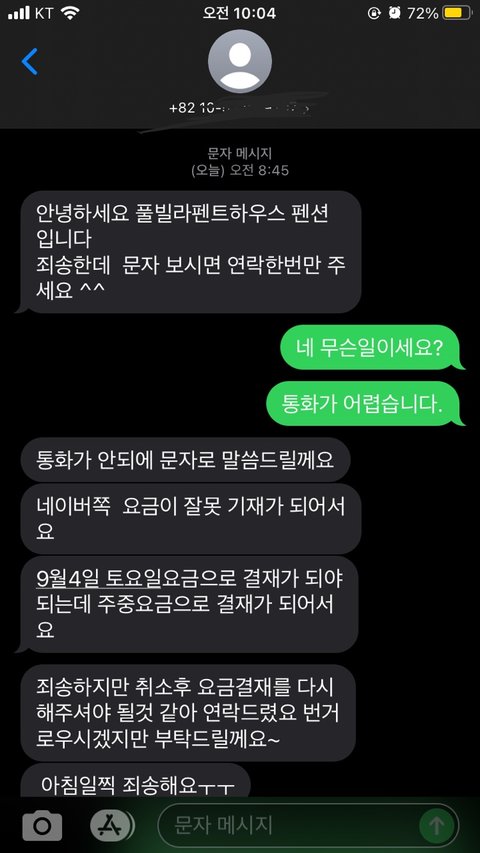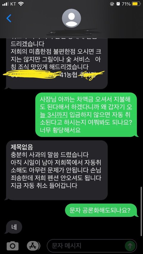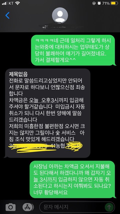 그로부터 약 한달 뒤 오늘, 아침일찍 한통의 문자가 도착합니다. 본인이 통화가 불가한 상황이었으므로 문자로 대화한내역 하나도 빠짐없이 캡쳐해서 올립니다.