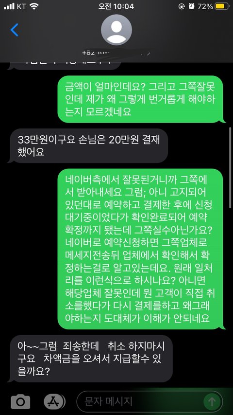 많은 관심속에 저의 어투와 관련하여 말들이 많은 것 같아 추가합니다. 본인은 무려 한달여전에 확정되어 결제한것을 자세한 설명없이 ' 네이버 측의 실수로 그 금액이 아니니 취소했다가 다시하라. ' 는 식의 문자에 ' 아니 이걸 한지가 언젠데 이제와서? 그리고 왜 고객이 실수한것도 아닌데 고객더러 직접 처리 하라는거지? 그래서 도대체 그 금액은 얼마이며..' 등 처음부터 황당하다 라는 생각이 들었습니다. 그리하여 그 금액은 얼마인거며, 고객 잘못도 아닌데 왜 고객이 하는거냐 물은거고 돌아온답은 내야할금액 33만원이고 내가 낸돈은 20만원 이라는 거였습니다. 순간 ' 이 업체는 처음에 이런식으로 올려놓고 예약해놓으면 시간지나 이런식으로 추가결제 받는식의 업체인건가? ' 라는 생각도 들고 기분이 상당히 불쾌하여 말투까지 하나하나 신경쓰며 말할만큼의 배려를 보일 수 없었습니다. 저 업체에 바라는거 없고 저도 이런다고해서 얻는거 없는거 잘 알고 그러기위해 올린글도 아닙니다. 실수해놓고 나몰라라, 싫으면말고 식의 이런일도 있으니 조심하시라는 목적으로 올린겁니다. 논점이 흐려진거같아 상황설명을 좀 더 추가하였으며 이점 참고하시어 봐주시면 감사하겠습니다.