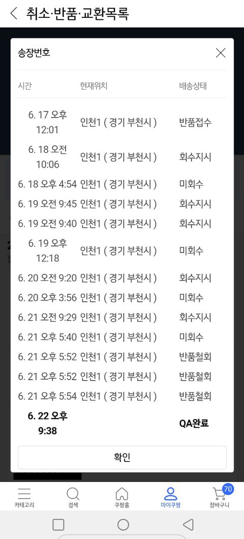 낮12시쯤이 되자 쿠팡기사님이라며 전화가 왔습니다반품회수를 해야하는데 물품이 없다는 것이었습니다큰아이에게 문앞을 확인해보라고 하니 기사님만 계시고 물품은 없다는 것이었습니다기사님에게 혹시 다른분이 회수한거 아니냐고 물으니 "그럴리가 없을건데요..일단 알겠습니다. 우선 미회수 처리하겠습니다"하고 돌아가시는 것이었습니다저는 약간 신경이 쓰였지만 대수롭지 않게 생각했습니다