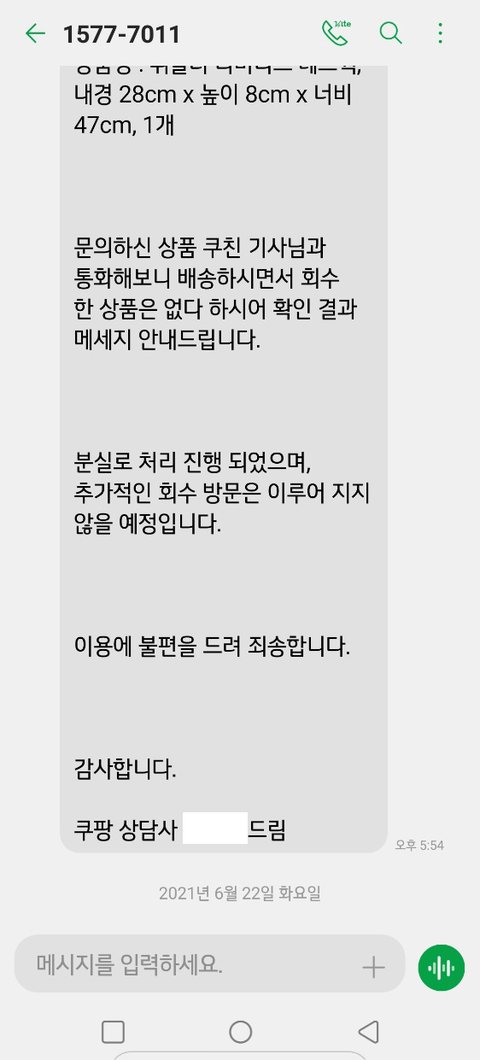 6월19일 오전에 쿠팡에서 회수한것이 확인되었습니다 늦은시간이라 다음날인 7월1일 쿠팡고객센터에 다시 전화를 걸었습니다그때 반품요청했는데 분실되었다는 물품은 아직까지 회수가 되지 않은것이 맞는지 확인해달라고 다시 요청해보았습니다역시나 회수된것이 없고 고객님에게 책임을 묻지 않으니 안심하라는 것이었습니다저는 책임이 문제가 아니라 집앞에 물건이 없어졌는데 어떻게 안심을하냐고 하니 그럼 경찰에 신고하여 확인을 하라고 하는 것이었습니다