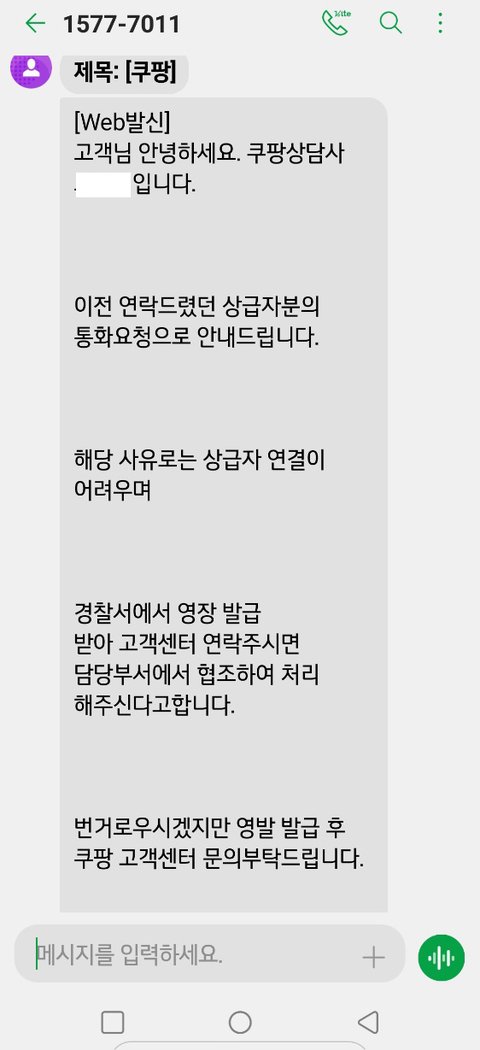 이후 경찰관이 쿠팡과 통화해 보셨나며 연락이 와서위와 같은 내용을 전달하니 황당해하시며 사건종결을 하려고 해도 쿠팡측에 확인이 필요하니직접 그 사람과 통화해보겠다고 통화한 상급자 연락처나 이름을 알려달라 하셨습니다다시 고객센터와 통화하였습니다제가 통화한 상급자가 누구인지 고객센터에 전화해서 연결될 수 있도록 이름을 알려달라고 하니알려줄 수 없다고 합니다!경찰서에서 내용 확인차 통화를 하고 싶어하니 상급자분이 저한테 연락을 좀 주실수 있도록전달해 달라고 하니 다음과 같은 문자를 받았습니다
