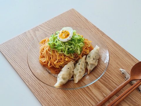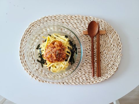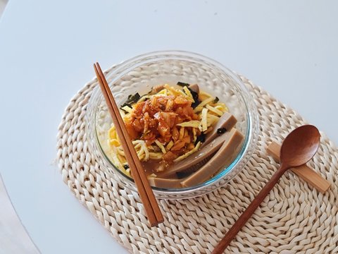 도토리묵, 김가루, 달걀지단, 양념김치 올려 냉면육수 부어주면 끝!