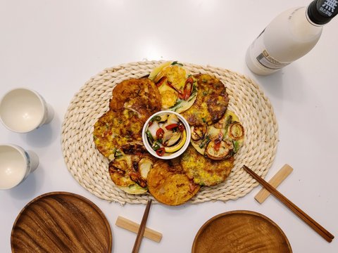 오징어 새우 파전과 김치전, 옥수수전을 부치고, 미리 만들어둔 고추 양파절임을 얹어 먹어요