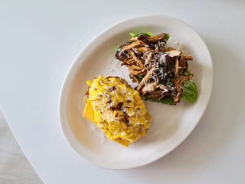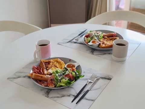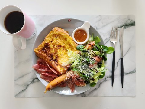 보들보들 촉촉하게 구운 프렌치토스트에 샐러드와 닭가슴살 소세지, 베이컨을 담은 빵모닝