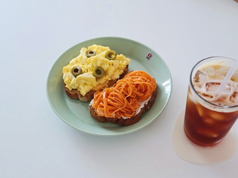 먹기전에 빵은 바삭하게 데워 하나는 달걀을 올리고 하나는 그날그날 먹고싶은걸 올려요