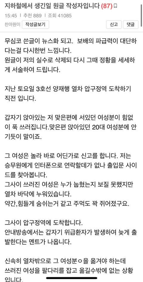 댓글에서 저한테 훌륭하시다고 하는데, 정말 어려운일도 아니고, 당연한 일을 했을 뿐입니다. 눈앞에서 사람이 쓰려졌는데 어떻게 안돕나요.