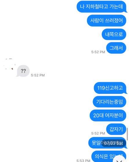 최근 며칠간 인터넷을 거의 안했더니 어떤 소식이 있는지도 모르고 살았는데 방금 그날 만났던 친구가 전화와서 이거 네 이야기 아니냐고 묻더라고요. 링크를 보내주면서요.처음에는 7월 3일 토요일 지하철에서 쓰러진 여성분이 그분만 있는건 아니니까 했는데 기사를 읽으면서 장화라는 대목에서 그분이야기가 맞구나 확실해지더군요.사실 저도 귀찮아서 가만히 있으려고 했는데 인터넷에 검색해보니 이 사건에 대한 잘못된 정보가 일파만파 퍼진것 같아서 가장 파급력이 높다고 생각한 네이트판에 글을 씁니다.
