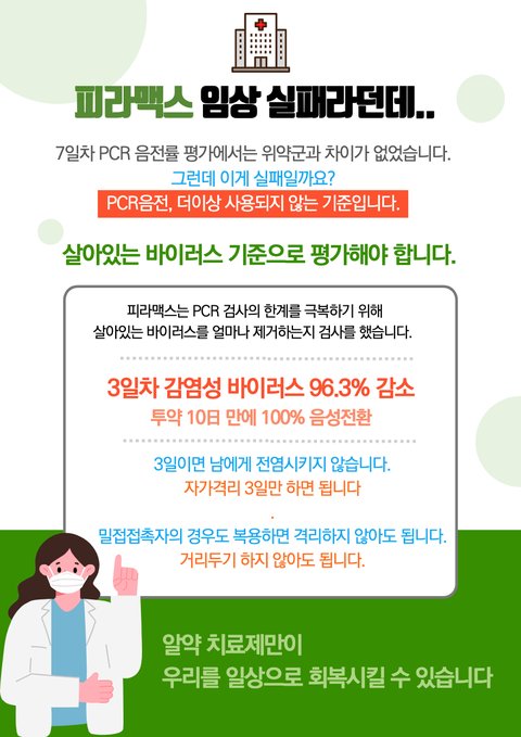 신풍제약㈜관계자는 "2단계 임상시험은 피라맥스가 COVID-19 환자에서 바이러스를 억제하고 임상 결과를 개선하는 데 있어 가능한 역할을 시사한다"고 말했다. 2단계 연구의 성격이 탐구적이고 표본 크기가 작았기 때문에 전체 모집단에서 통계적 유의성을 달성하지 못했다. COVID-19 관리에서 피라맥스의 잠재적인 역할은 대규모 임상시험에서 평가될 것이다."